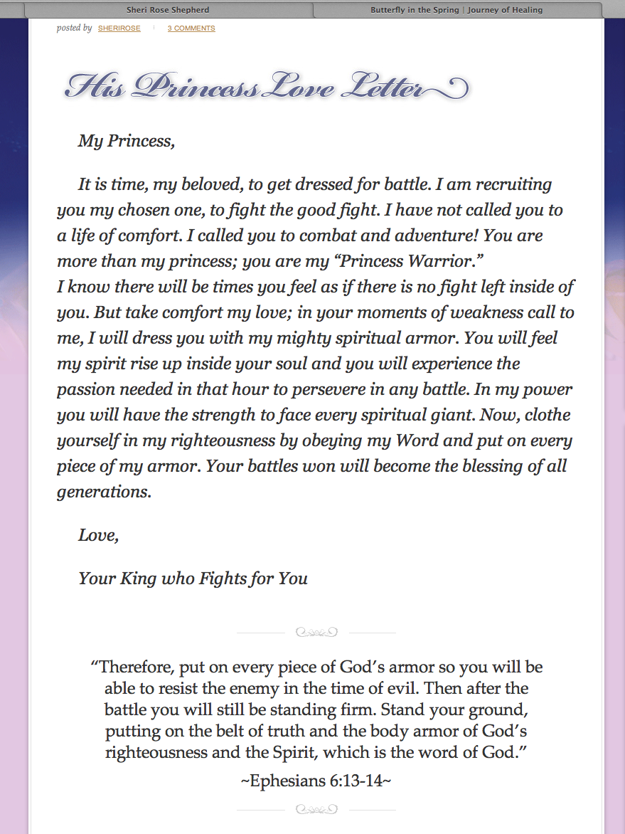 Today’s Love Letter from Sheri Rose Shepherd’s http://www.hisprincess.com echoes the verse on fighting the good fight.